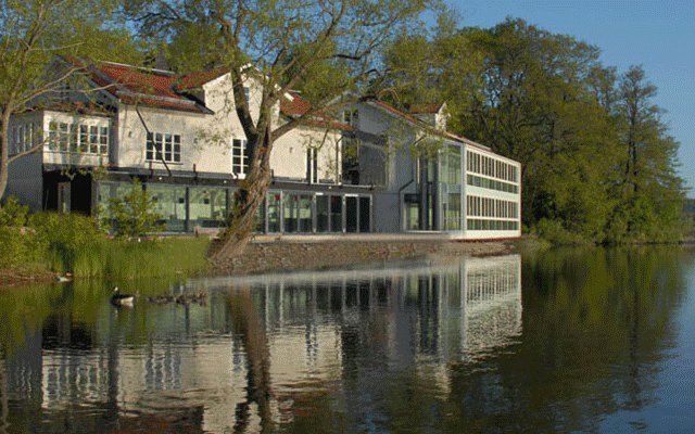 Vi satt på övre våningen i den där utstickande glasgrejen längst till höger på bilden. Från sin matplats har man vatten rakt nedanför sig, och sen utsikt över sjön både åt vänster och åt höger. Å, jag älskar Sundby gård!